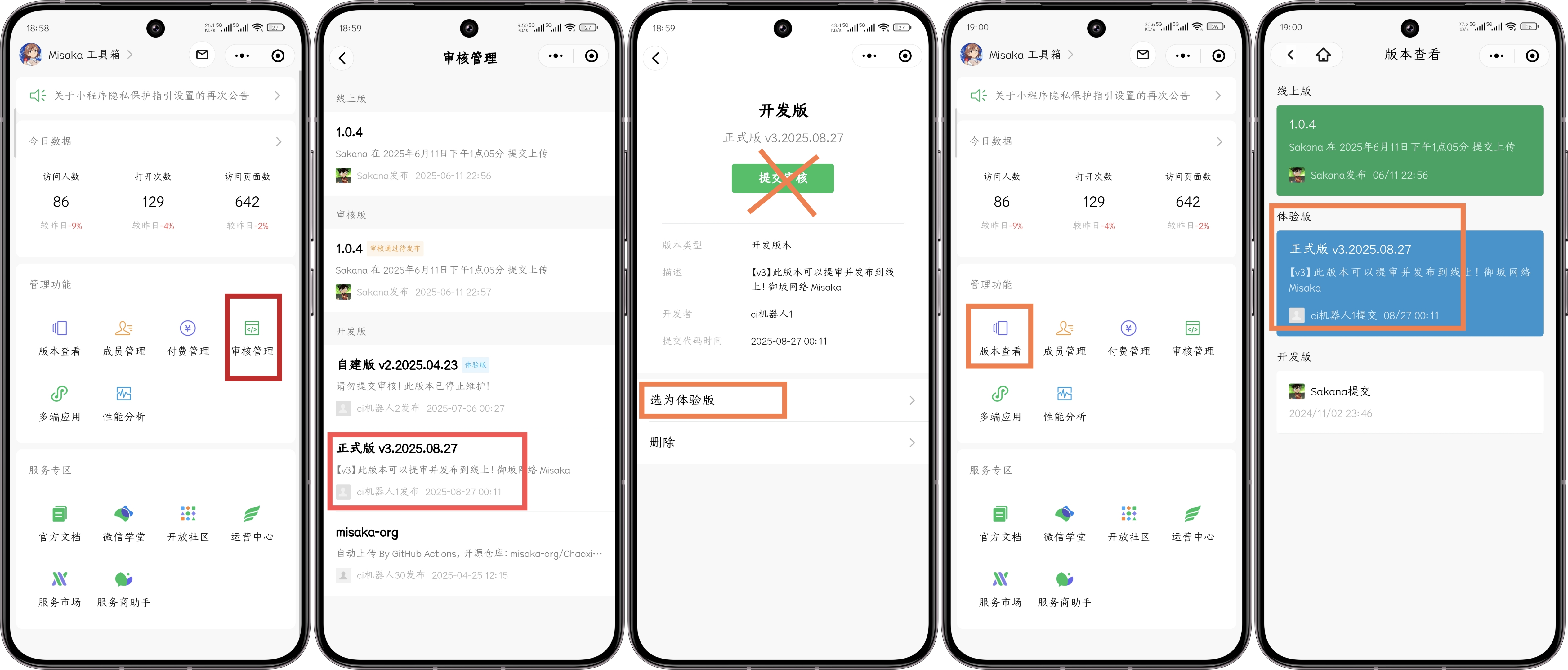 - 按图示,进审核管理,将 v3 版本设置为体验版,不要提交审核。